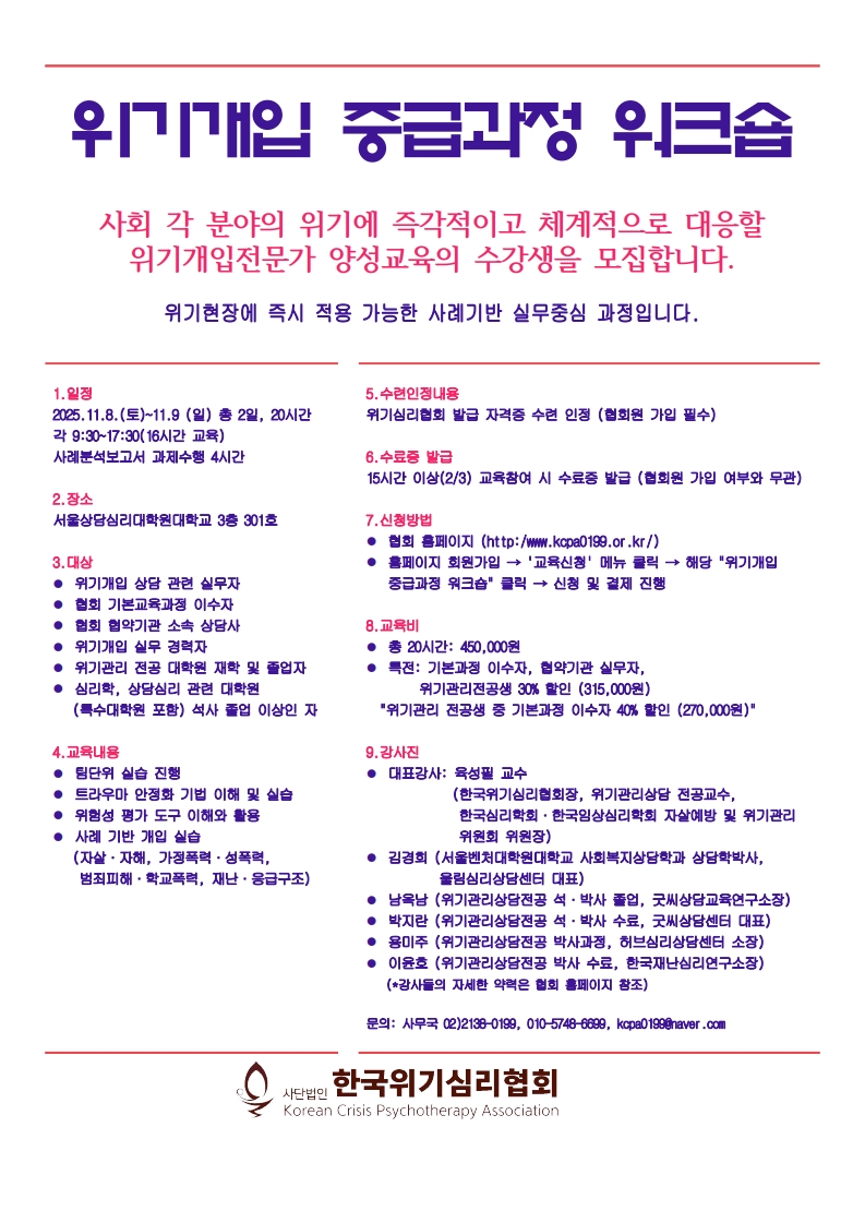 2025 위기개입 중급과정 워크숍 안내(일정 변경) 페이지 정보 작성자 최고관리자 조회 25회 작성일 2025-10-30 17:25 목록 본문 . 관련링크 http://www.kcpa0199.or.kr/page/edu_02.php 16회 연결 다음글한가위 명절, 건강과 행복을 기원합니다 25.10.02