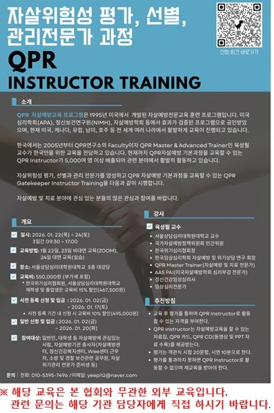 [QPR Instructor Training] 자살위험성 평가 선별 관리 전문가 양성 과정(※ 본 협회와 무관한 외부 교육)